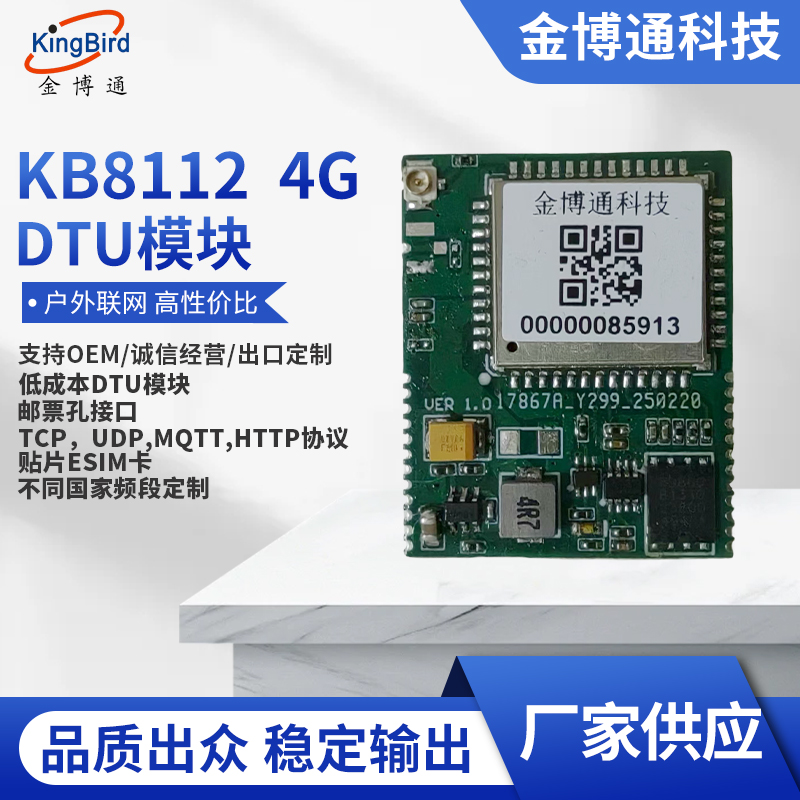 隨著物聯(lián)網(wǎng)的發(fā)展,越來(lái)越多的用戶單位需要將自己的產(chǎn)品配上4G模塊來(lái)上物聯(lián)網(wǎng)系統(tǒng),但用戶買來(lái)4G模塊后,需要進(jìn)行軟件和硬件的開(kāi)發(fā),這得必須配上一位軟件工程師和一位硬件工程師,而且產(chǎn)品從開(kāi)發(fā)到成熟,至少要半年、一年甚至兩年的時(shí)間,人力成本至少要投入20萬(wàn),而且耗時(shí)又長(zhǎng)。而我公司推出的KB8112 4G DTU模塊,是在4G模塊基礎(chǔ)之上將軟件,硬件(電源,天線,SIM卡等)全部開(kāi)發(fā)成熟的4G DTU模塊,用戶可直接使用,無(wú)需軟硬件的開(kāi)發(fā),它支持TCP/UDP/MQTT/HTTP的協(xié)議,而且成本低,體積小,含貼片ESIM卡(配四年的流量),郵票孔接口,方便用戶大批量的貼片生產(chǎn)。